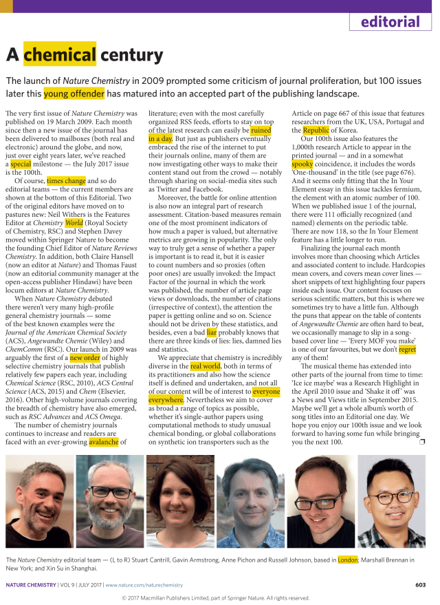 As with most people, I suspect, I signed up to Twitter not really having any idea what it might be useful for. The trigger was one of Nature Chemistry‘s sister journals, Nature Materials, signing up to Twitter; after noticing that they had taken the plunge, in March of 2009 I created accounts for myself (@stuartcantrill) and the journal (@NatureChemistry). The journal account now has more than 200k followers and we use it to tweet about anything related to chemistry that we think our followers might find interesting.