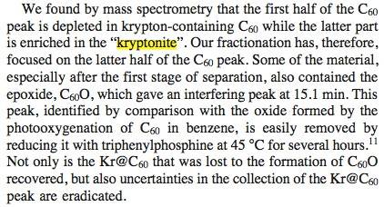 To finish off, however, let’s bring this back down to Earth. Did you know that ‘kryptonite’ has been synthesized in a real chemistry lab and the results were reported in JACS? Yes, really! The paper, Isolation and Spectral Properties of Kr@C60, a Stable van der Waals Molecule, was published in 1999 and the kryptonite in question is the compound made up of a krypton atom trapped inside the buckminsterfullerene cage — an example of an endohedral fullerene. Seems like a reasonable name to me, it has krypton in it after all! And here’s the proof from the paper itself: