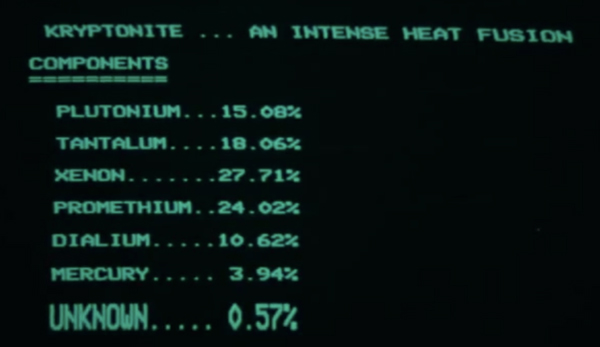 ‘Simply’?! OK, first off, I know this is a movie, but allow me to point out the flaw in the logic here. You don’t know what kryptonite is, so how do you lock on to a floating chunk of it? How do you know that you haven’t locked on to lump of adamantium, dilithium or vibranium? Anyway, back to the plot. That’s some awesome analytical chemistry going on right there. A laser fired from a satellite hits a lump of kryptonite and the computer back on Earth figures out exactly what it’s made of — here are the results:
