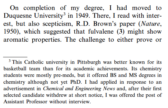 For reasons that will become apparent in a few months (it’s not that exciting), I have spent a lot of today looking at papers associated with the discovery and early structural studies of ferrocene. I have come across wonderful footnotes (and notices) in some journals. Below is one from the Journal of Organometallic Chemistry that I thought I’d share. It’s from an article by Peter Pauson recounting how the story of ferrocene all began. If only it was so easy to get a job these days…! I’ll try and share a few more of these footnotes/notices if I get a chance.