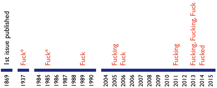 It’s only in 1989 that ‘fuck’ is first used in anger. While reviewing Stephen Jay Gould’s Wonderful Life, Richard Fortey repeats a quote (“Oh fuck, another new phylum”) featured in the book. The remaining 7 instances of ‘fucked’, ‘fuck’ and ‘fucking’ are also found in quotes rather than being the authors’ own words, and appear in news stories, news features or the Books & Arts section. So, that’s 8 deliberate fucks in roughly 145 years; one every 18 years or so, although it’s clearly not an even distribution. If the rate of usage continues to pick up as it has done over the past few years, expect to see more clusters of fucks in the near future.
