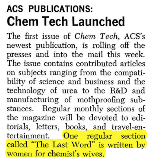 As with the launch of many new chemistry publications, the arrival of CHEMTECH (or Chemical Technology as was its official title back then) was heralded in the pages of Chemical & Engineering News. I’m sure that the ‘technology of urea’ and ‘the R&D and manufacturing of mothproofing substances’ would prove to be fascinating, but something else included in the description of what this new publication was going to cover was something that you wouldn’t (and shouldn’t) see today (that said, it wasn’t appropriate back in 1971 either). Just in case you were wondering, I’ve highlighted in yellow the offending bit in the passage I’ve grabbed from the pdf… yikes.