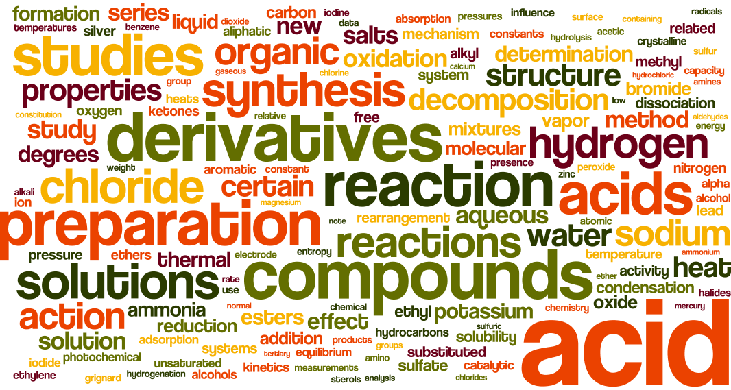 The Nature Chemistry title-word cloud was not based on a particularly large data set, however, and is also from a very recent period. I wondered if the titles of chemistry papers have changed much over time, and so I decided to look to a journal with a lot more history. I wanted it to be a general chemistry journal to ensure there was no intrinsic bias towards words associated with a particular sub-field within chemistry and so I turned to the Journal of the American Chemical Society (JACS).