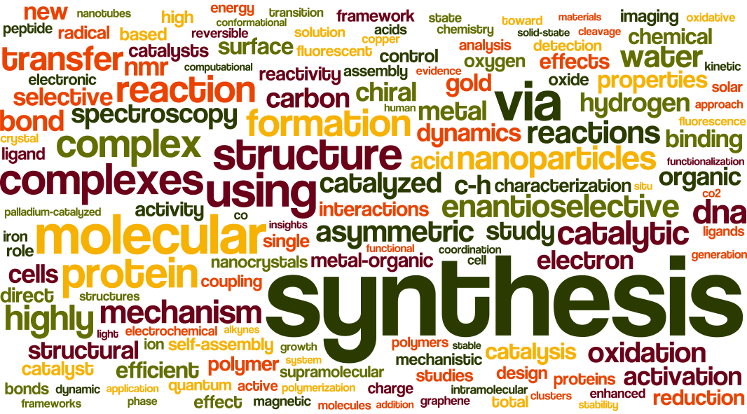 Synthesis remains dominant, but words such as ‘kinetics’ and ‘mechanism’ are growing larger, suggesting that there is an increasing drive to understand reactions as well. And ‘stereochemistry’ rears its head in the cloud for the first time.
